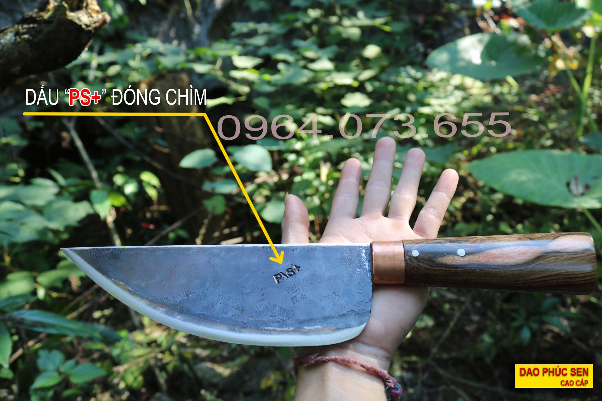 DAO PHÚC SEN CAO CẤP đóng chìm dấu "PS+" trên thân dao như hình bên dưới và đã được bảo hộ. Mọi hành vi sao chép ảnh để kinh doanh là vi phạm pháp luật.